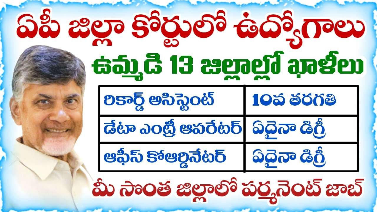 AP District Court Jobs: ఆంధ్రప్రదేశ్ జిల్లా కోర్టుల్లో ఉద్యోగాలు భర్తీకి నోటిఫికేషన్ విడుదల చేశారు. పాత జిల్లాల ప్రాతిపదికన ఉమ్మడి 13 జిల్లాల్లో ఖాళీలు భర్తీకి నోటిఫికేషన్ విడుదల చేశారు. రికార్డ్ అసిస్టెంట్, డేటా ఎంట్రీ ఆపరేటర్, ఫ్రంట్ ఆఫీస్ కోఆర్డినేటర్ పోస్టులను భర్తీ చేస్తున్నారు. 10వ తరగతి, ఏదైనా డిగ్రీ విద్యార్హతలు కలిగిన అభ్యర్థులు దరఖాస్తు చేసుకోవటానికి అవకాశం ఉంటుంది. 18 నుంచి 42 సంవత్సరాల లోపు ఉన్న అభ్యర్థులు దరఖాస్తు చేసుకోవచ్చు. అర్హత కలిగిన అభ్యర్థులు ఆఫ్లైన్ ద్వారా దరఖాస్తు చేసుకోవాలి. అర్హత, వయస్సు, జీతం, దరఖాస్తు, ఎంపిక విధానం వివరాలు తెలుసుకుందాం..