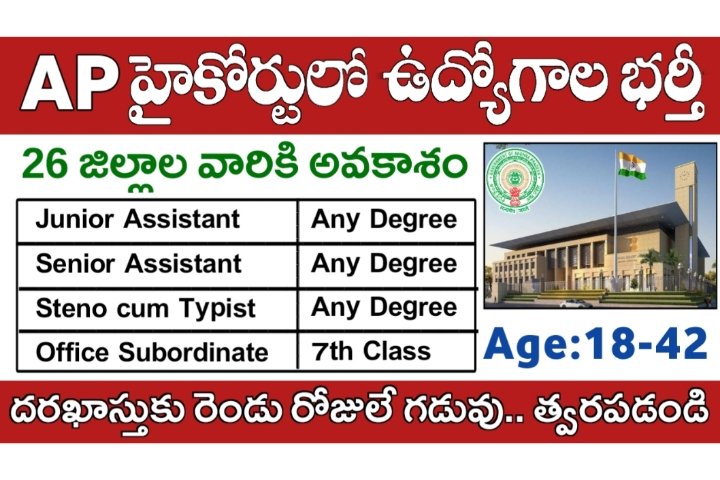 ఆంధ్రప్రదేశ్ హైకోర్టు లీగల్ సర్వీసెస్ అథారిటీ నుండి ఉద్యోగాల భర్తీ కోసం మరో కొత్త నోటిఫికేషన్ విడుదలైంది. సీనియర్ అసిస్టెంట్, జూనియర్ అసిస్టెంట్, స్టెనో కం టైటిస్ట్, ఆఫీస్ సబార్డినేట్ పోస్టుల భర్తీకి నోటిఫికేషన్ విడుదల చేశారు. 7వ తరగతి ఏదైనా డిగ్రీ విద్యార్హతలు కలిగిన అభ్యర్థులు దరఖాస్తు చేసుకోవచ్చు. రాత పరీక్ష, స్కిల్ టెస్ట్, ఇంటర్వ్యూ ఆధారంగా అభ్యర్థులను ఎంపిక చేస్తారు. ఆంధ్రప్రదేశ్ రాష్ట్రంలోని 26 జిల్లాల వారు దరఖాస్తు చేసుకోవచ్చు. ఈ ఉద్యోగాలకు Offline ద్వారా దరఖాస్తు చేసుకోవాలి. దరఖాస్తు కు మరో రెండు రోజులు మాత్రమే గడువు ఉంది. సెప్టెంబర్ 14 వ తారీకు లోపు దరఖాస్తు చేసుకోవాలి. అర్హత, వయస్సు, జీతం, దరఖాస్తు, ఎంపిక విధానం వివరాలు తెలుసుకుందాం…