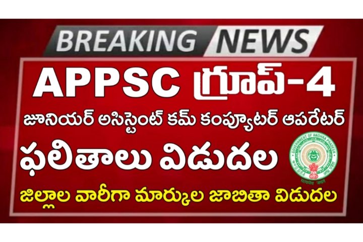 ఆంధ్రప్రదేశ్ రాష్ట్రంలో ఏపీపీఎస్సీ గ్రూప్-4 జూనియర్ అసిస్టెంట్ కం కంప్యూటర్ ఆపరేటర్ మెయిన్స్ పరీక్షల ఫలితాలు విడుదలయ్యాయి. జిల్లాల వారీగా పరీక్షలు రాసిన అభ్యర్థుల యొక్క మార్కుల జాబితాను విడుదల చేశారు. క్రింది లింక్ పై క్లిక్ చేసి పరీక్షలు రాసిన అభ్యర్థులు మార్కుల జాబితాను తెలుసుకోవచ్చు. జిల్లాల వారిగా మార్కుల జాబితాతో పాటు ఫైనల్ కీ కూడా psc.ap.gov.in వెబ్సైట్ లో విడుదల చేశారు. నియామకాలకు సంబంధించిన తదుపరి ప్రక్రియ సంబంధిత జిల్లా కలెక్టర్లు పూర్తి చేయనున్నారు. మొత్తం 670 జూనియర్ అసిస్టెంట్ కం కంప్యూటర్ ఆపరేటర్ పోస్టుల భర్తీకి ఏప్రిల్ 4న రాతపరీక్ష నిర్వహించారు.