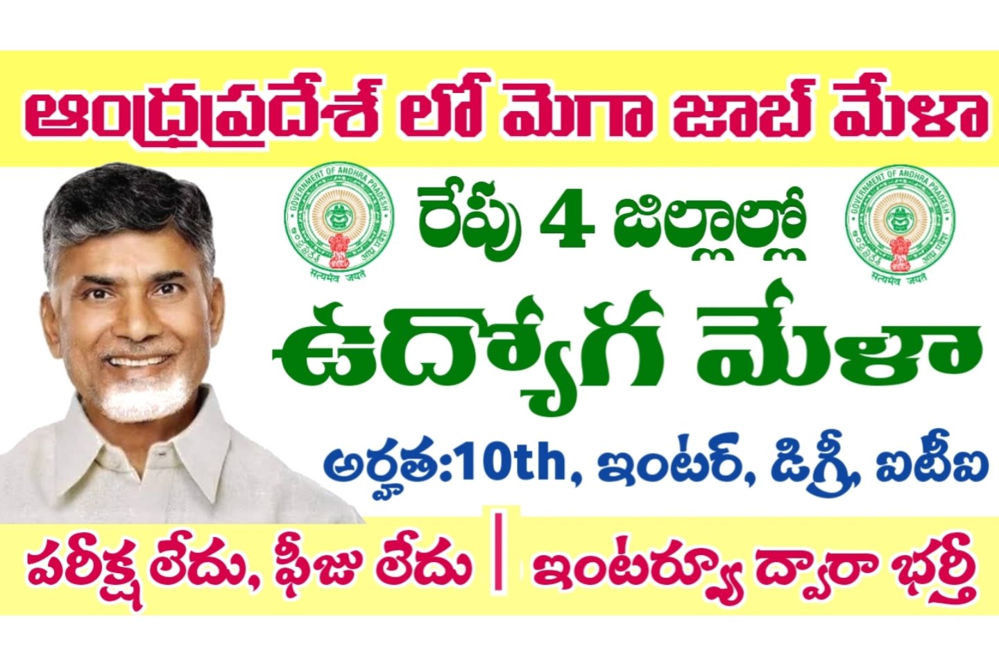 AP Job Mela: ఆంధ్రప్రదేశ్ రాష్ట్రంలోని 4 జిల్లాల్లో డిసెంబర్ 28న జాబ్ మేళా నిర్వహిస్తున్నారు. ఎటువంటి రాతపరీక్ష లేకుండా ఉద్యోగాలను భర్తీ చేస్తారు. అనంతపురం జిల్లా, అల్లూరి సీతారామరాజు జిల్లా, కాకినాడ జిల్లా, ఏలూరు జిల్లాల్లోని నిరుద్యోగులకు ఉపాధి కల్పించేందుకు.. ఏపీ నైపుణ్యాభివృద్ధి సంస్థ, జిల్లా ఉపాధి కల్పన శాఖ, సిడాప్ సంయుక్త ఆధ్వర్యంలో జాబ్ మేళా నిర్వహిస్తున్నారు. పదవ తరగతి, ఇంటర్మీడియట్, డిగ్రీ, ఐటీఐ, డిప్లొమా, బీటెక్, పీజీ విద్యార్హత కలిగిన అభ్యర్థులు జాబ్ మేళాలో పాల్గొనవచ్చు. ప్రముఖ కంపెనీలలో ఉద్యోగాలు భర్తీ చేస్తారు. డైరెక్ట్ ఇంటర్వ్యూ ద్వారా అభ్యర్థులను ఎంపిక చేస్తారు.
