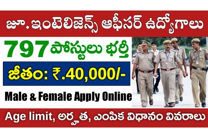 గవర్నమెంట్ ఆఫ్ ఇండియా, మినిస్ట్రీ ఆఫ్ హోం అఫైర్స్, ఇంటెలిజెన్స్ బ్యూరో నుంచి జూనియర్ ఇంటెలిజెన్స్ ఆఫీసర్ గ్రేడ్-2 ఉద్యోగాల భర్తీకి నోటిఫికేషన్ విడుదలైంది. మొత్తం 797 పోస్టులను భర్తీ చేస్తున్నారు. డిగ్రీ, డిప్లొమా విద్యార్హతలు కలిగిన అభ్యర్థులు దరఖాస్తు చేసుకోవచ్చు. ఇవి కేంద్ర ప్రభుత్వ ఉద్యోగాలు కాబట్టి ఆంధ్రప్రదేశ్, తెలంగాణ రెండు తెలుగు రాష్ట్రాలకు సంబంధించిన అభ్యర్థులు దరఖాస్తు చేసుకోవచ్చు. ఆన్లైన్లో దరఖాస్తు చేసుకోవాలి.