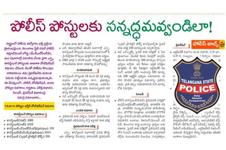 తెలంగాణ రాష్ట్రంలో పోలీస్ కానిస్టేబుల్ మరియు ఎస్ఐ ఉద్యోగాల భర్తీ కోసం నోటిఫికేషన్లు విడుదలయ్యాయి. మొత్తం 16,614 పోస్టులను భర్తీ చేస్తున్నారు. క్రింద ఉన్న PDF Link పై క్లిక్ చేసి నోటిఫికేషన్ లకు సంబంధించిన పూర్తి వివరాలను తెలుగులో తెలుసుకోగలరు. Download PDF