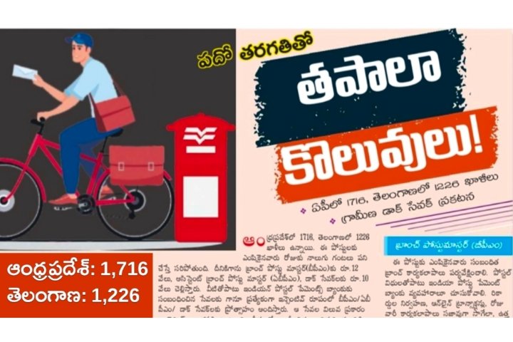 ఆంధ్రప్రదేశ్, తెలంగాణ రాష్ట్రాల్లో తపాల శాఖలో గ్రామీణ డాక్ సేవక్ ఉద్యోగాల భర్తీకి నోటిఫికేషన్ విడుదలైంది. పదవ తరగతి విద్యార్హత కలిగిన వారు ఈ ఉద్యోగాలకు దరఖాస్తు చేసుకోవచ్చు. ఆంధ్రప్రదేశ్ రాష్ట్రంలో 1716, తెలంగాణ రాష్ట్రంలో 1226 ఉద్యోగాలు భర్తీ చేస్తున్నారు. క్రింద ఉన్న PDF Link పై క్లిక్ చేసి నోటిఫికేషన్ సంబంధించిన పూర్తి వివరాలు తెలుసుకోగలరు. Download PDF