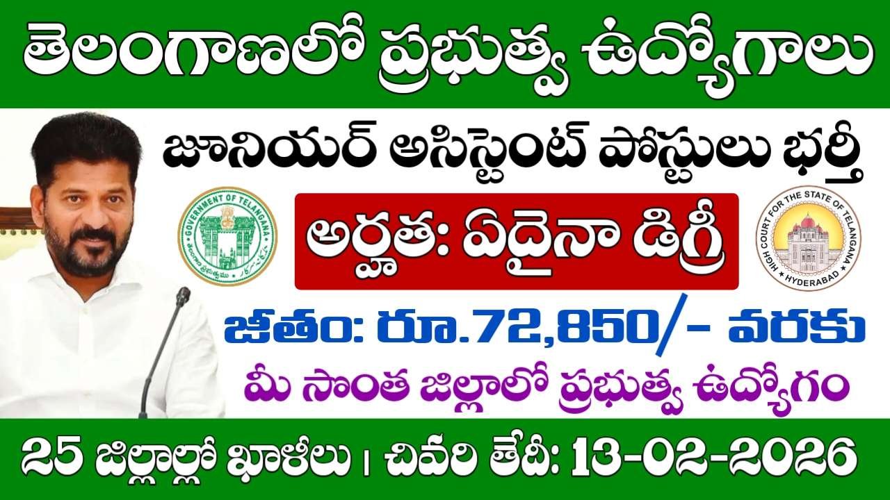 జూనియర్ అసిస్టెంట్ ఉద్యోగాలకు అర్హత కలిగిన అభ్యర్థులు 24-01-2026 తేదీ నుంచి 13-02-2026 తేదీ లోపు దరఖాస్తు చేసుకోవాలి.