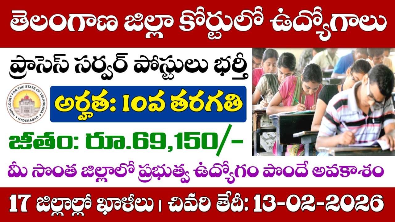 TG Court Jobs: తెలంగాణ జిల్లా కోర్టుల్లో ప్రాసెస్ సర్వర్ ఉద్యోగాలు భర్తీకి నోటిఫికేషన్ విడుదల. తెలంగాణ జ్యుడీషియల్ మినిస్ట్రీయల్ అండ్ సబార్డినేట్ సర్వీస్ నుంచి నోటిఫికేషన్ విడుదలైంది. పదవ తరగతి విద్యార్హత కలిగిన అభ్యర్థులు దరఖాస్తు చేసుకోవచ్చు. తెలంగాణలోని 17 జిల్లాల్లో ఖాళీలు ఉన్నాయి. 18 నుంచి 46 సంవత్సరాల లోపు ఉన్న అభ్యర్థులు దరఖాస్తు చేసుకోవచ్చు. అర్హత కలిగిన అభ్యర్థులు ఆన్లైన్ ద్వారా దరఖాస్తు చేసుకోవాలి. అర్హత, వయస్సు, జీతం, దరఖాస్తు, ఎంపిక విధానం వివరాలు తెలుసుకుందాం..