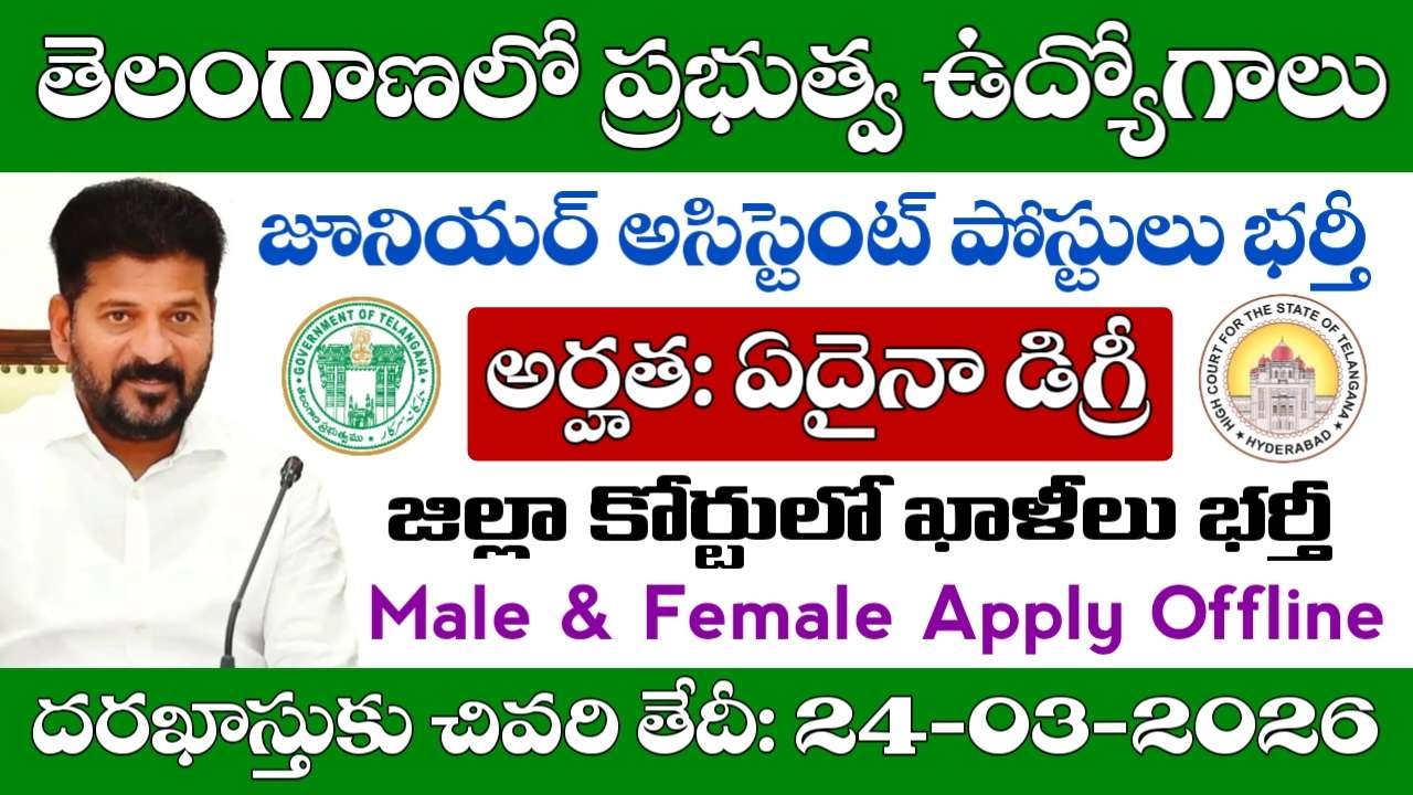 TS District Court Junior Assistant Notification 2026 – తెలంగాణ రాష్ట్రంలో జిల్లా కోర్టులో జూనియర్ అసిస్టెంట్ ఉద్యోగాలు డైరెక్ట్ రిక్రూట్మెంట్ ద్వారా భర్తీకి మరో కొత్త నోటిఫికేషన్ విడుదలైంది. డిస్ట్రిక్ట్ లీగల్ సర్వీసెస్ అథారిటీ మహబూబాబాద్ నుంచి జూనియర్ అసిస్టెంట్ పోస్టులు భర్తీకి నోటిఫికేషన్ విడుదల చేశారు. ఈ ఉద్యోగాలకు డిగ్రీ అర్హత కలిగిన బెడ్తల దరఖాస్తు చేసుకోవచ్చు. 18 నుంచి 34 సంవత్సరాల లోపు ఉన్న అభ్యర్థులు దరఖాస్తు చేసుకోవడానికి అవకాశం ఉంటుంది. అర్హత, వయస్సు, దరఖాస్తు విధానం, ఎంపిక విధానం వివరాలు తెలుసుకుందాం..