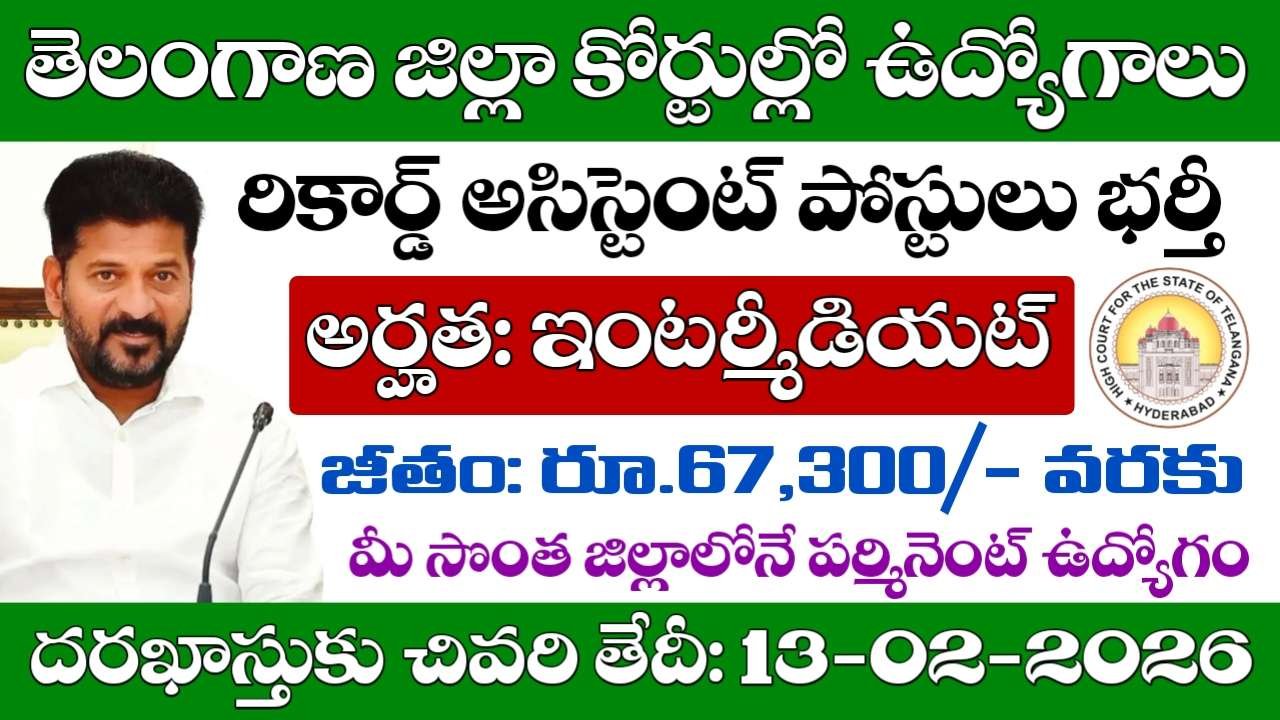 TS District Court Record Assistant Jobs: తెలంగాణ జిల్లా కోర్టులో రికార్డ్ అసిస్టెంట్ ఉద్యోగాలు భర్తీకి నోటిఫికేషన్ విడుదలైంది. తెలంగాణ జ్యుడీషియల్ మినిస్ట్రీయల్ అండ్ సబార్డినేట్ సర్వీస్ నుంచి నోటిఫికేషన్ విడుదలైంది. ఇంటర్మీడియట్ విద్యార్హత కలిగిన అభ్యర్థులు దరఖాస్తు చేసుకోవటానికి అవకాశం ఉంటుంది. 18 నుంచి 46 సంవత్సరాల లోపు ఉన్న అభ్యర్థుల దరఖాస్తు చేసుకోవచ్చు. తెలంగాణ రాష్ట్రంలోని మొత్తం 10 జిల్లాల్లో ఖాళీలు ఉన్నాయి. అర్హత కలిగిన అభ్యర్థులు ఆన్లైన్ ద్వారా దరఖాస్తు చేసుకోవాలి అర్హత, వయస్సు, జీతం, దరఖాస్తు, ఎంపిక విధానం వివరాలు తెలుసుకుందాం..