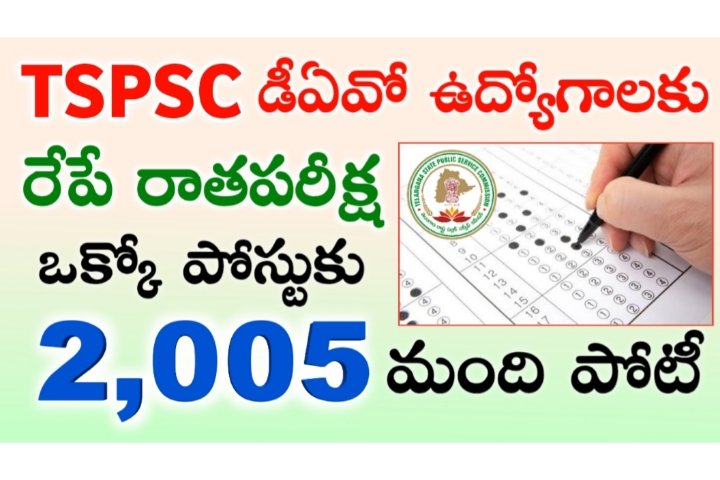 తెలంగాణ రాష్ట్రంలో 53 డివిజనల్ అకౌంట్స్ ఆఫీసర్ (వర్క్స్) గ్రేడ్-2 ఉద్యోగాల భర్తీకి ఈ నెల 26న రాతపరీక్ష నిర్వహించనున్నట్టు టీఎస్పీఎస్సీ తెలిపింది. ఉదయం 10 గంటల నుంచి 12.30 గంటల వరకు పేపర్-1, మధ్యాహ్నం 2.30 గంటల నుంచి సాయంత్రం 5 గంటల వరకు పేపర్-2 పరీక్షలను నిర్వహించనున్నారు. మొత్తం 53 ఉద్యోగాలకు అత్యధికంగా 1,06,263 దరఖాస్తులు రాగా, ఒక్కో పోస్టుకు సగటున 2,005 మంది అభ్యర్థులు పోటీ పడుతున్నారు. రాష్ట్రంలో 53 డీఏవో ఉద్యోగాల భర్తీకి 2022 ఆగస్టు 4న టీఎస్పీఎస్సీ నోటిఫికేషన్ విడుదల చేసిన విషయం తెలిసిందే. అభ్యర్థులు తమ హాల్టికెట్లను www.tspsc.gov.in వెబ్సైట్ నుంచి డౌన్లోడ్ చేసుకోవచ్చు.